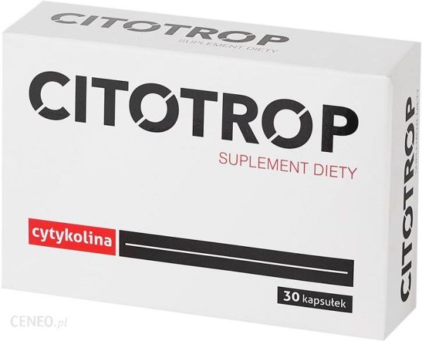 Suplement dietyGłównym składnikiem Citotrop jest CDP-cholina (cytydylo-5difosfocholina). CDP-cholina jest naturalnie występującym, endogennym prekursorem fosfatydylocholiny, podstawowego budulca fosfolipidów błon komórkowych. CDP-cholina ulega hydrolizie do cytydyny i choliny, które łatwo przenikają przez barierę krew-mózg i odgrywają wiodącą rolę w syntezie i odbudowie błon komórek nerwowych. CDP-cholina poprzez zwiększenie syntezy acetylocholiny i wpływ na syntezę fosfolipidów pozytywnie oddziałuje na prawidłowe funkcjonowanie mózgu.Zastosowanie: suplementacja diety w skladniki wspomagające prawidłowe funkcjonowanie mózgu.Zalecane spożycie: 1-2 kapsułki dziennie. Kapsułkę należy popić odpowiednia ilością wody. Zawartość kapsułki można wsypać i rozpuścić w około 50ml ciepłego płynu.Składniki: sól sodowa cytydylo-5difosfocholiny, substancje pomocnicze: stearynian magnezu, wodorofosforan wapnia, kapsułka: żelatyna, dwutlenek tytanu.1 kapsułka zawiera: cytydylo-5difosfocholinę 250mg.Przeciwwskazania: produkt niewskazany dla kobiet w ciąży i karmiących piersią.Ważne wskazówki:Nie należy przekraczać zalecanej dziennej porcji.Zrównoważony sposób żywienia i prawidłowy tryb życia jest ważny dla funkcjonowania organizmu człowieka.Suplement diety nie może być stosowany jak substytut (zamiennik) zróżnicowanej diety.Suplementy diety powinny być przechowywane w sposób niedostępny dla małych dzieci, w temperaturze pokojowej i w suchym miejscu, chronić od światła i bezpośredniego działania słońca.