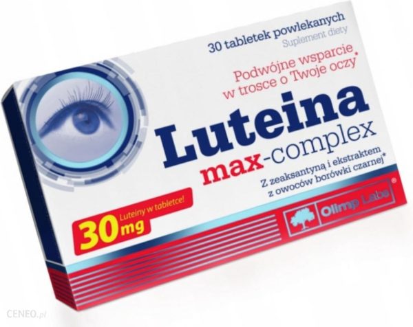 OLIMP LUTEINA MAX-COMPLEX 30 TABLETEKLuteina Max-Complex to wysokiej jakości, farmaceutycznie przebadany suplement diety od firmy Olimp Laboratories, który pozwoli zadbać o Twoje oczy. Skład preparatu w formie łatwych do połknięcia tabletek powlekanych stanowią cenne dla prawidłowego funkcjonowania wzorku: luteina, zeaksantyna, które dodatkowo wsparte zostały działaniem ekstraktu z owoców borówki czarnej. Luteina wraz z zeaksantyną występują w oku, głównie w plamce żółtej, która odpowiada m.in. za ostrość naszego widzenia. Luteina będąca naturalnym karotenoidem jest także rozproszona w siatkówce i soczewce oka. Dzienna suplementacja preparatem Luteina Max-Complex pozwala dostarczyć do organizmu 30mg luteiny i 2,5mg wspomnianej zeaksantyny. Ich działanie pozwalające utrzymać wzrok w dobrej kondycji wspiera ekstrakt z owoców borówki czarnej oraz zawarte w nim antocyjanidyny. Wykazuje on pozytywny wpływ na zmysł wzroku, dzięki właściwościom antyoksydacyjnym. Pomaga neutralizować działanie szkodliwych wolnych rodników oraz pozwala zadbać o naczynia krwionośne. Luteina Max-Complex z uwagi na produkcję w warunkach farmaceutycznych jest suplementem całkowicie bezpiecznym w stosowaniu. Jego skład powstał w oparciu o bogatą wiedzę i wieloletnie doświadczenie specjalistów Olimp Laboratories. Każdy ze składników, dzięki nowatorskiej technologii, został poddany dokładnym analizom pod kątem czystości i obecności metali ciężkich. Preparat stanowi zatem cenne wsparcie dla osób dbających o swój wzrok.